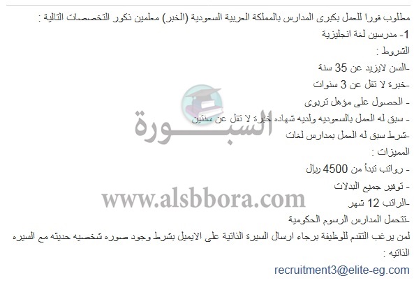 تعلن مدرسة خاصة في السعودية عن وظائف جديدة للمعلمين والمعلمات بمرتبات تبدأ من 4500 ريال وذلك وفقا لنص الإعلان التالي:-