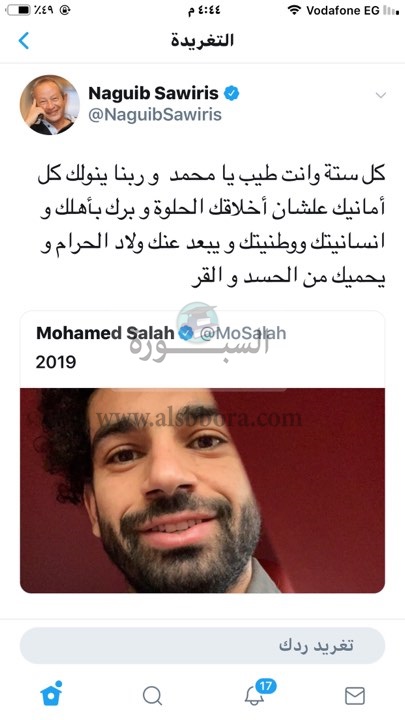 وجه رجل الاعمال نجيب ساويرس التهنئية للنجم العالمى محمد صلاح لاعب منتخبنا القومى ونادى ليفربول الانجليزى عبر حسابة على موقع التواصل الاجتماعى " توتير "