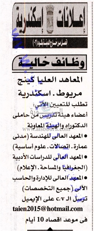 تعلن المعاهد العليا بكينج مريوط بالاسكندرية عن حاجتها الى اعضاء هيئة التدريس، وعلى الراعبين فى التقدم ارسال السيرة الذاتية عبر الايميل المنشور فى اعلان جريدة الاهرام اليوم الجمعة الموافق 4 يناير 2019.