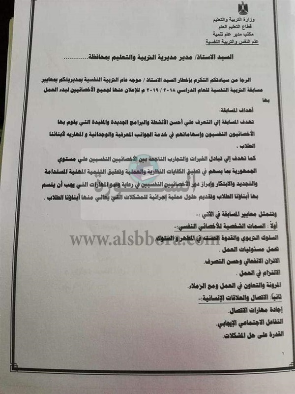 اعلنت وزارة التربية والتعليم عن مسابقة جديدة للاخصائيين النفسيين حيث ارسلت خطابا الى جميع المديريات التعليمية بمعايير المسابقة والتى تهدف الى التعرف على احسن الانشطة والبرامج الجديدة والمفيدة التى يقوم بها الاخصائيين النفسيين واسهاماتهم فى خدمة الجوانب المعرفية والوجدانية والمهارية لابنائنا الطلاب.