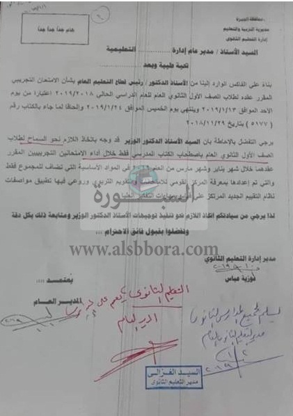 ارسلت وزارة التربية والتعليم فاكسا للمديريات التعليمية ، اكدت فيه انه بناء على تعليمات رئيس قطاع التعليم بشأن الامتحان التجريبى المقرر عقده لطلاب الصف الاول الثانوى خلال العام الدراسى 2018 / 2019 ، اعتبارا من يوم الاحد 13 يناير وينتهى يوم الخميس 24 يناير والحاقا بالكتاب رقم 51 77 بتاريخ 27 نوفمبر 2018