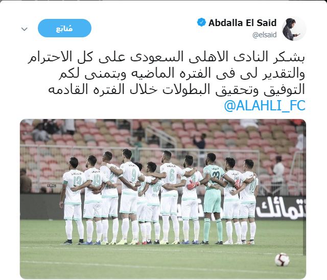 وقال انه يشكر ادارة ولاعبى الأهلى السعودى بعد الدعم الذى قدموه له خلال الفترة الماضية والمحافظة على مستواه الفنى، متمنيا لهم المزيد من تحقيق البطولات.