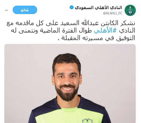 قدم نادى الاهلى السعودى الشكر لصانع العابه السابق عبدالله السعيد على ما قدمه فى الفترة الماضية، متمنيا له التوفيق فى مسيرته الفترة المقبلة مع نادى بيراميدز.