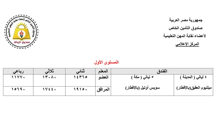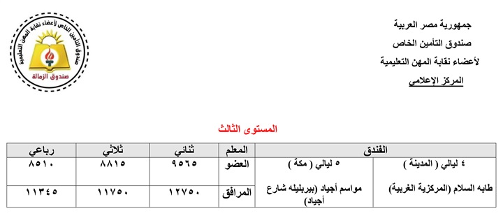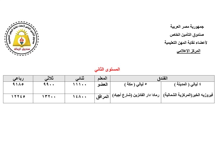 أما المستوى الثانى طيران فقيمته للعضو بالنسبة للغرفة الثنائية 11 آلف و100 جنيه مصرى ، والغرفة الثلاثية 9 آلاف و900 جنيهاً مصرياً ، والغرفة الرباعية 9 آلاف و185 جنيهاً مصرياً، وللمرافق الغرفة الثنائية 14 آلف و 800 جنيهاً مصرياً ، و الغرفة الثلاثية 13 آلف و200 جنيهاً مصرياً ، و الغرفة الرباعية 12 آلف و245 جنيهاً، على أن تكون الإقامة بفنادق أربع نجوم.