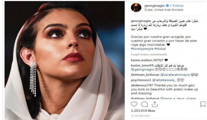 خطفت عارضة الأزياء جورجينا رودريجز، خطيبة نجم الكرة العالمية كريستيانو رونالدو، الأنظار في إجازتها الأخيرة بدبي، بعد ظهورها بالأزياء التقليدية الإماراتية وتوجيهها رسالة باللغة العربية.