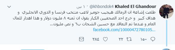 وقال فى تغريدة له على حسابه الشخصى "تويتر" طلعت إشاعة ان الزمالك هيجيب جوميز لاعب منتخب فرنسا و الدوري الانجليزي و هداف كبير و خرج احد الصحفيين الكبار يقول ان ثمنه ٨ مليون دولار و هذا اهدار للمال العام و عندما تم التعاقد مع حسين الشحات بـ ٦ ونص مليون...