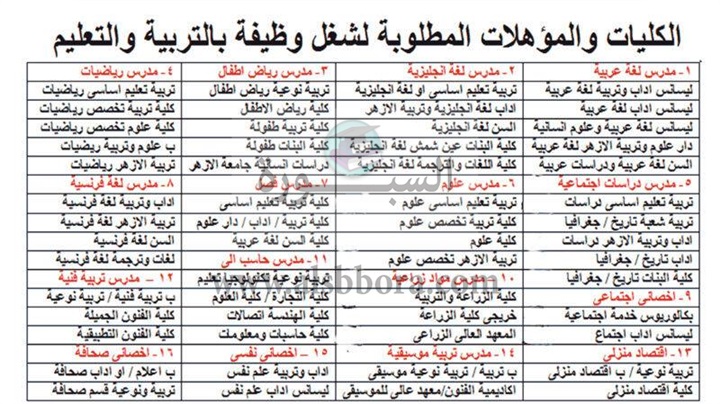 ينشر موقع السبورة الكليات والمؤهلات المطلوبة لوزارة التربية والتعليم لشغل وظائف المعلمين على مستوى الجمهورية لسد العجز فى المدارس، والتى من المقرر ان تعلن عنها وزارة التربية والتعليم خلال الايام المقبلة.