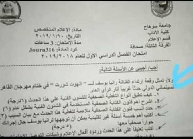 فاجأ استاذ مادة الاعلام المتخصص بقسم الاعلام بكلية آداب جامعة سوهاج طلابه فى امتحان الترم الأول للعام الدراسى الحالى 2019/2018 بسؤال عن ظهور الفنانة رانيا يوسف بالهوت شوت وهى ترتدى احد فساتينها والذى اثار ضجة اثناء تواجدها فى مهرجان القاهرة السينمائى خلال الايام الماضية.