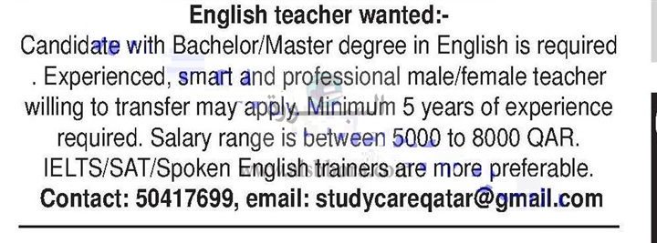 تعلن مدرسة خاصة في دولة قطر عن وظائف جديدة للمعلمين والمعلمات بمرتبات تصل إلي 8000 ريال وذلك وفقا لنص الإعلان التالي:-