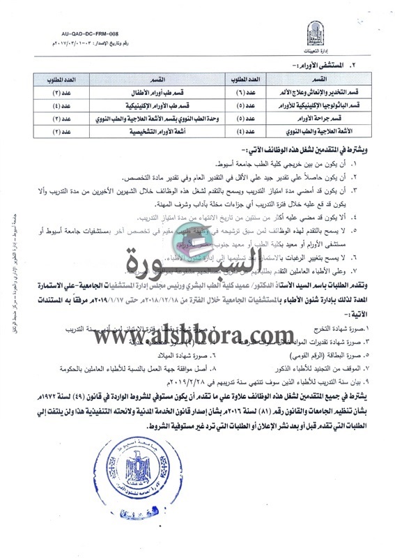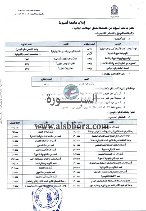 تعلن جامعة أسيوط عن وظائف جديدة لأعضاء هيئة التدريس "من معيد إلي أستاذ" علما بأن أخر موعد للتقديم الخميس المقبل وفقا لما جاء في نص الإعلان التالي:-