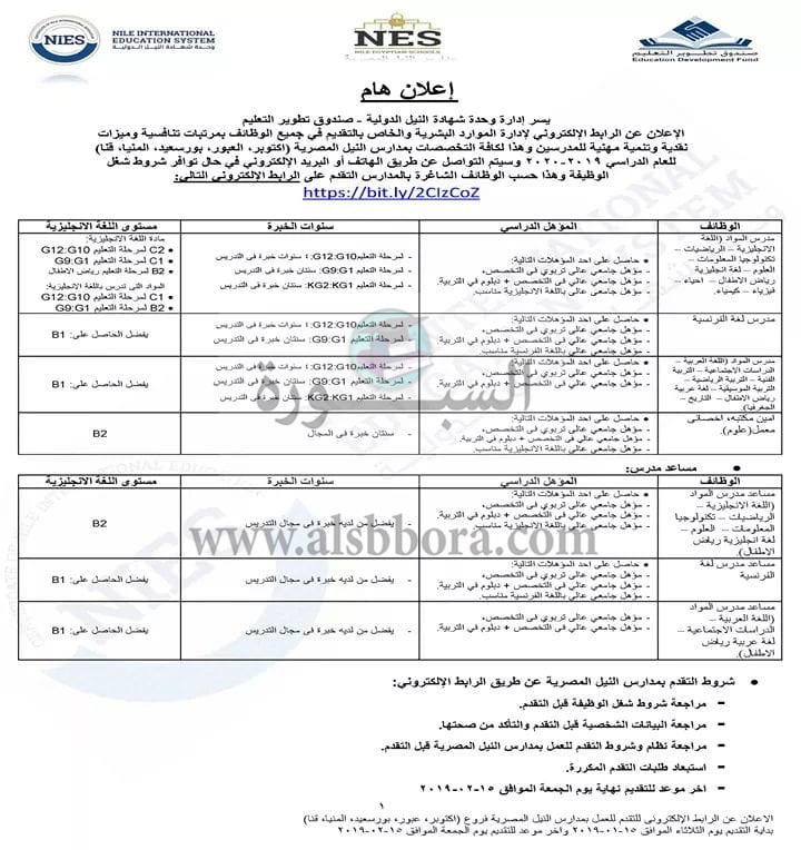 تعلن الإدارة الموارد البشرية بمدارس النيل المصرية (اكتوبر، العبور، بورسعيد، المنيا، قنا) عن وظائف للمعليمن لكافة التخصصات بمرتبات تنافسية وميزات نقدية للعام الدراسي 2019-2020 .