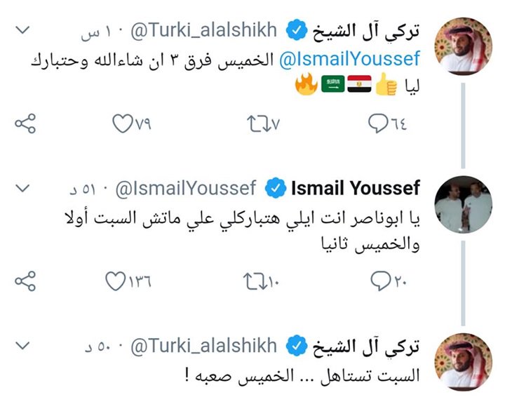 اشعل تركى آل شيخ مالك نادى بيراميدز واسماعيل يوسف عضو مجلس ادارة نادى الزمالك السوشيال ميديا، عندما تبادلا عبر تويتر التويتات الساخنة بينهما.