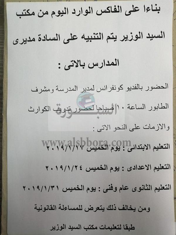 وبناء على الفاكس الوارد من مكتب الوزير يتم التنبيه على مديرى المدارس بالاتى: الحضور بالفيديو كونفرانس ومشرف الطابور الساعة 10 صباحا لحضور تدريب الكوارث والازمات على النحو التالى: