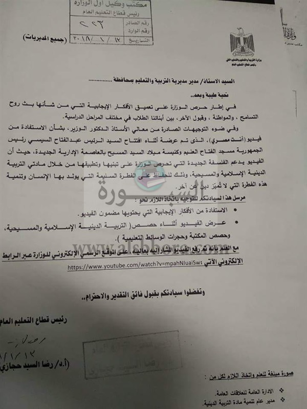ارسلت وزارة التربية والتعليم والتعليم الفنى خطابا الى جميع المديريات التعليمية ليتم توزيعه على المدارس والتطبيق سوف يبدأ فى الترم الثانى من العام الدراسى الحالى 2019/2018.