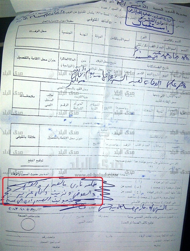 ويأتى تقرير الطب الشرعى والذي ننشر صورة منه، مناقضاً تماما لما صرح به الدكتور هشام عبد الحميد، المتحدث الرسمي باسم مصلحة الطب الشرعي على فضائية"cbc"، امس الخميس، حيث أكد ان عملية تشريح جثمان الطالب كشفت عن وجود آثار 3 طلقات خرطوش في صدره وبطنه من النوع الذى لا تستخدمه الشرطة، ويعتبر تصريح المتحدث الرسمى مناقضاً للحالة المدونة بالتقرير النهائى، والذى أكد أن سبب الوفاة هو طلق ناري بالصدر والظهر والحوض ونزيف غزير بتجويف الصدر أدى إلي الوفاة