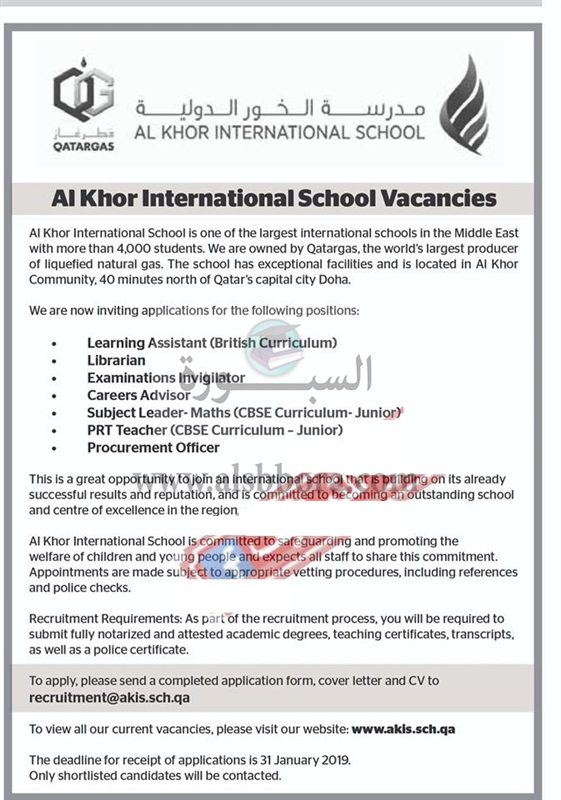 تعلن مدارس الخور القطرية عن وظائف جديدة للمعلمين والمعلمات في جميع المواد وذلك وفقا لنص الإعلان التالي:-