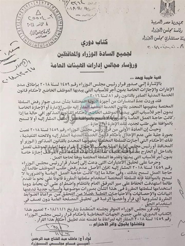 مجلس الوزراء يصدر قرارا مهما الى جميع موظفى الدولة.. مستند