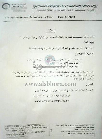 تعلن الشركة المتخصصة لاعمال الكهرباء والطاقة الشمسية عن حاجتها الى مهندسين كهرباء، وعلى الراغبين فى التقدم الحضور الى مقر الشركة من يوم 20 يناير حتى يوم 20 فبراير 2019 من الساعه 10 صباحاً حتى الساعة 2 ظهراً .