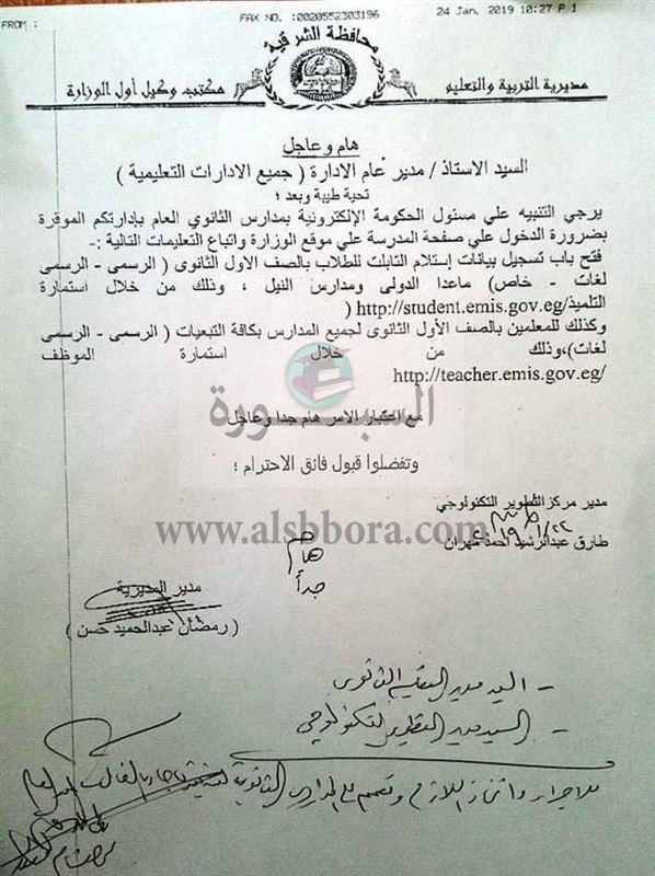 ارسلت مديرية التربية والتعليم بالشرقية فاكسا مهما تحت شعار عاجل الى جميع الادارات التعليمية بشأن استلام التابلت للمعلمين والطلاب والدخول على صفحة المدرسة على موقع الوزارة واتباع التعليمات التالية من خلال الفاكس التالى: