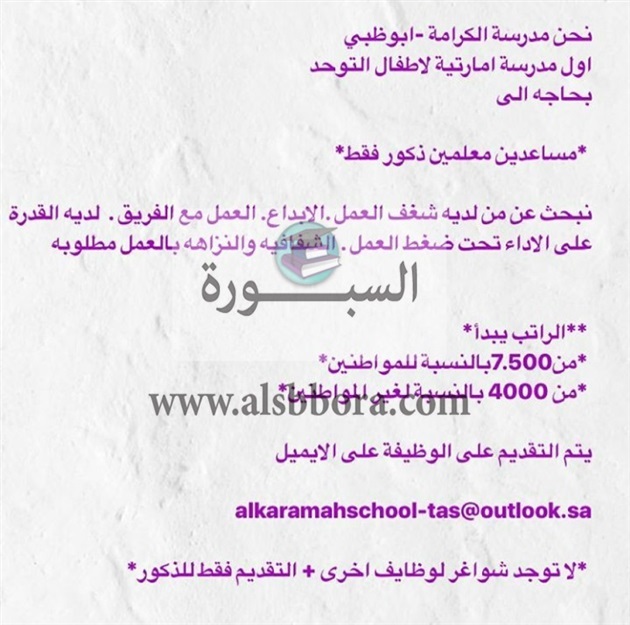 أعلنت مدرسة خاصة بأبوظبي عن وظائف جديدة للمعلمين والمعلمات بمرتبات متميزة وذلك وفقا لنص الإعلان التالي:-