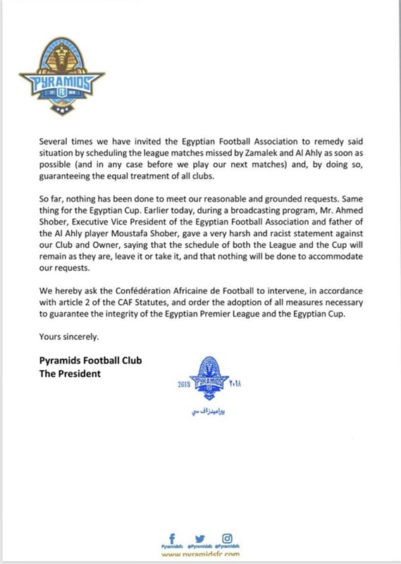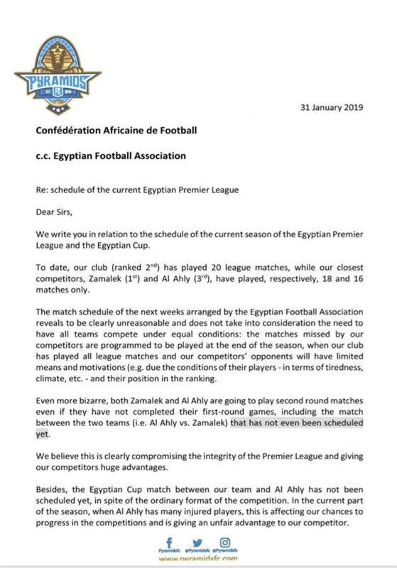 ونشر على صفحته خطابا رسميا الى الاتحاد الافريقى باللغة الانجليزية يشكو فيه عدم انتظام مسابقة الدورى، موضحا ان الاهلى والزمالك لم يلتقيا فى الدور الأول رغم بداية الدور الثانى ووصوله الى الجولة الـ 20، بالاضافة الى عدم ظهور معالم مسابقة كأس مصر.