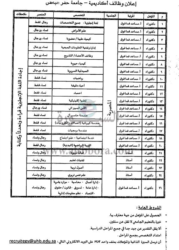تعلن جامعة حفر الباطن السعودية عن وظائف جديدة لأعضاء هيئة التدريس المصريين في 26 تخصص وذلك وفقا لنص الإعلان التالي:-