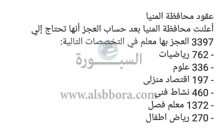 اعلنت مديرية التربية والتعليم بمحافظة المنيا حاجتها الى 3397 معلما لسد العجز على مستوى المدارس فى جميع المراحل التعليمية، حيث جاءت التخصصات كالتالى: