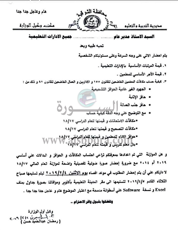 ارسلت مديرية التربية والتعليم بمحافظة الشرقية خطابا على جميع الادارات التعليمية تحت شعار "هام وعاجل جدا جدا" على ان يتم احضار الاتى على وجه السرعة، قيمة المرتبات الاساسية بالادارات التعليمية، قيمة الاجر الاساسى للمعلمين، كيفية احتساب مكافآت المعلمين الخاضعين لقانون 155 والاداريين والعمال الخاضعين لقانون 81.