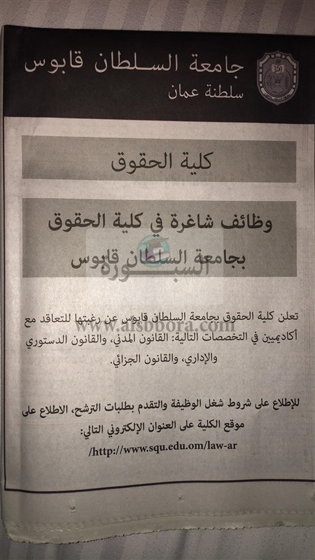 تعلن جامعة السلطان قابوس عن وظائف جديدة لأعضاء هيئة التدريس "من معيد إلي أستاذ" وذلك وفقا لنص الإعلان التالي:-