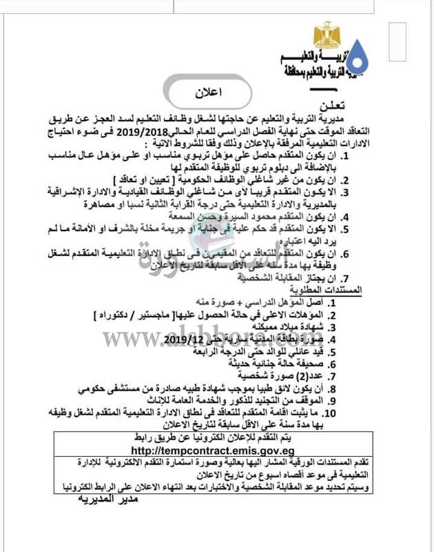 10 ما يثبت اقامة المتقدم للتعاقد فى نطاق الادارة التعليمية المتقدم لشغل وظيفة بها مدة سنة على الاقل سابقة لتاريخ الاعلان.