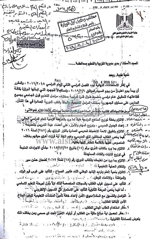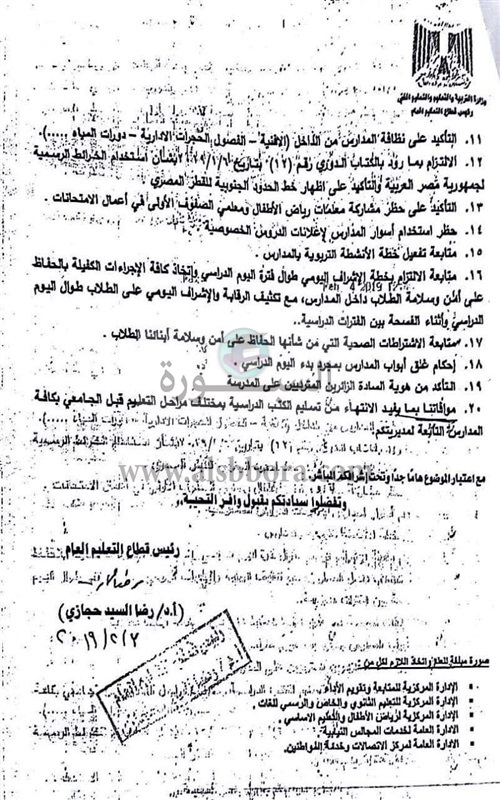 ارسلت وزارة التربية والتعليم والتعليم الفنى، خطابا مهما الى جميع المديريات التعليمية يحتوى على 20 نصيحة واجبة التنفيذ قبل بداية الترم الثانى للعام الدراسى الحالى 2019/2018، والذى سوف يبدأ من غد السبت فى بعض المدارس وباقى المدارس يوم الأحد الموافق 9 فبراير على مستوى الجمهورية، وجاء الخطاب كالتالى: