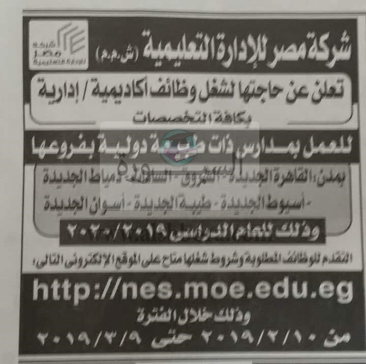 اعلنت شركة مصر للادارة التعليمية عن حاجتها الى شغل وظائف اكاديمية فى جميع التخصصات للعمل بمدارس دات طبيعة دولية فى مدن القاهرة الجديدة والشروق والسادات ودمياط الجديدة واسيوط الجديدة وطيبة الجديدة واسوان الجديدة، على ان يتم التقديم خلال الفترة من 10 فبراير الجارى الى 9 مارس المقبل، وعلى الراغبين فى التقديم من خلال الموقع الالكترونى المنشور فى الاعلان التالى: