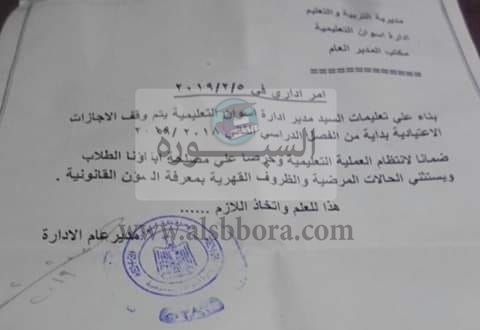 وجاء فى الامر الادارى بناء على تعليمات مدير ادارة اسوان التليمية يتم وقف الاجازات الاعتيادية بداية من الفصل الدراسى الثانى 2019/2018، ضمانا لانتظام العملية التعليمية وحرصا على مصلحة ابنائنا الطلاب ويستثنى الحالات المرضية والظروف القهرية بمعرفة الشئون القانونية.
