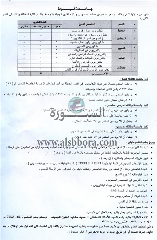 تعلن جامعة أسيوط عن وظائف جديدة لاعضاء هيئة التدريس "من معيد الى أستاذ" علما بأن أخر موعد للتقديم الخميس المقبل وذلك وفقا لنص الإعلان التالي:-
