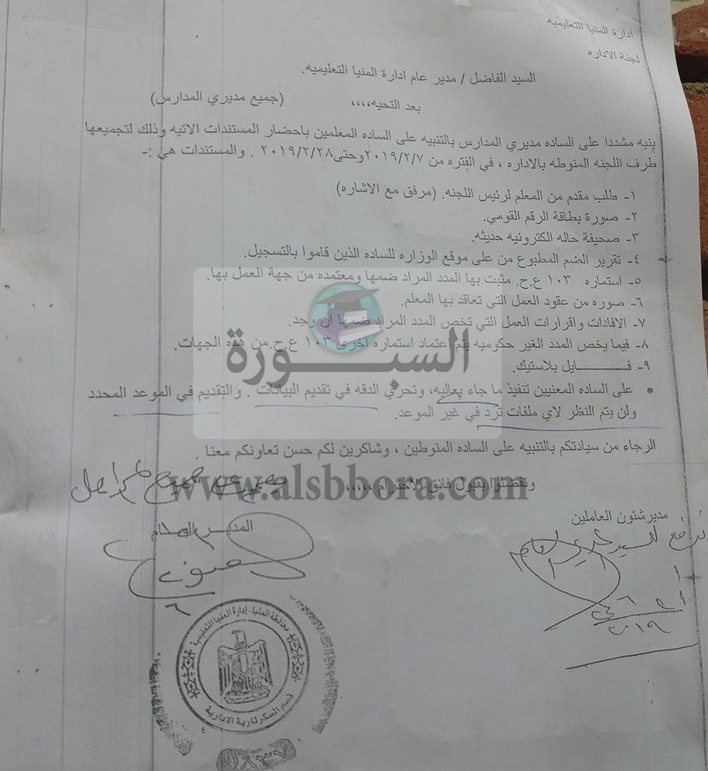 ارسلت ادارة المنيا خطابا على جميع مديرى المدارس فى المراحل التعليمية المختلفة بالتنبيه مشددا على المعلمين باحضار المستندات التالية وذلك لتجميعها طرف اللجنة المنوطة بالادارة فى الفترة من فبراير الى 28 من نفس الشهر الجارى, حيث جاء ت صورة الخطاب كالتالى: