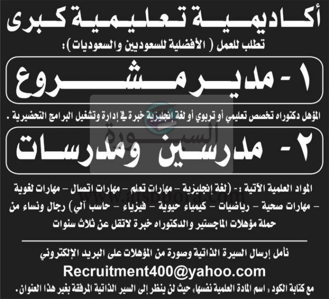 تعلن أكاديمية سعودية عن وظائف جديدة لـ"حملة الماجستير والدكتوراه" وذلك وفقا لنص الإعلان التالي: