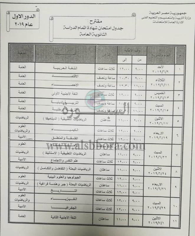 وجدير بالذكر أن امتحان شهادة إتمام الدراسة الثانوية العامة ستكون اعتبارًا من يوم الأحد الموافق 9/6/2019، ويستمر حتى يوم الخميس الموافق 1/7/2019.