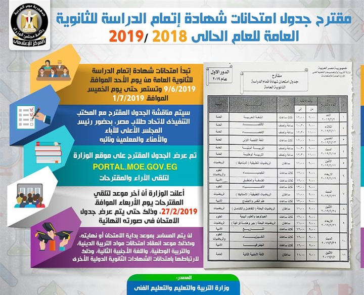 نشر المركز الإعلامي لمجلس الوزراء, إنفوجراف عن مقترح جدول امتحانات شهادة إتمام الدراسة للثانوية العامة للعام الحالي 2018/2019, أوضح من خلاله أنه من المقرر أن تبدأ الامتحانات من يوم الأحد الموافق 9/6/2019 وتستمر حتى يوم الخميس الموافق 1/7/2019, علماً بأنه سيتم مناقشة هذا الجدول مع المكتب التنفيذي لاتحاد طلاب مصر، بحضور رئيس المجلس الأعلى للآباء والأمناء والمعلمين ونائبه.
