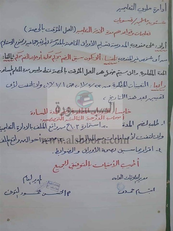 - أى من المعلمين ستواجد بديوان الإدارة بخصوص هذا الشأن سيتم اتخاذ الإجراءات القانونية معه.