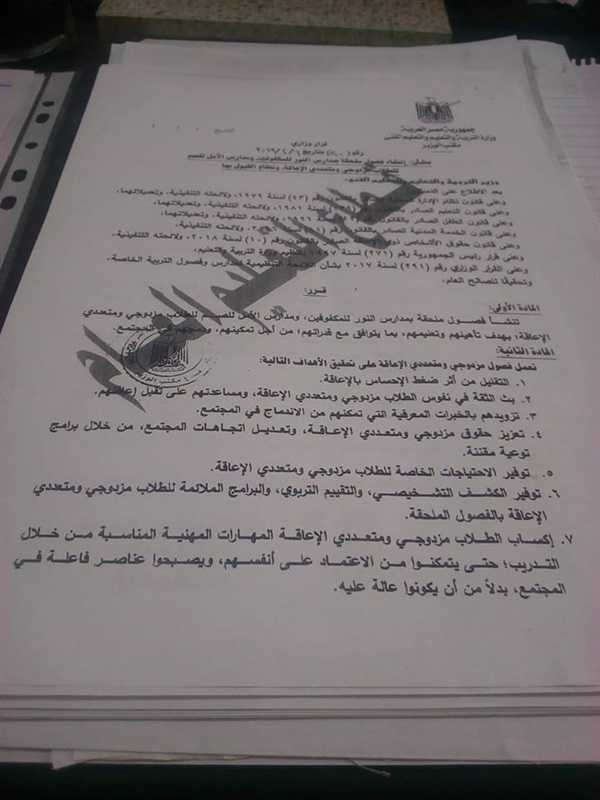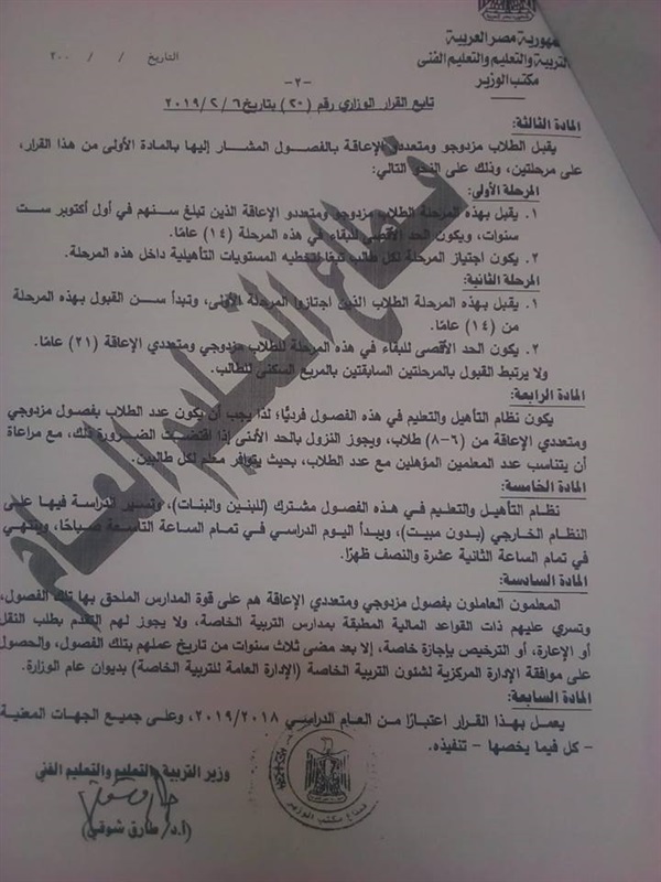 اصدر الدكتور طارق شوقى، وزير التربية والتعليم والتعليم الفنى قرارا وزاريا جديدا رقم 20 بتاريخ 6 فبراير لسنة 2019، بشان انشاء فصول مزدوجى ومتعددى الاعاقة.
