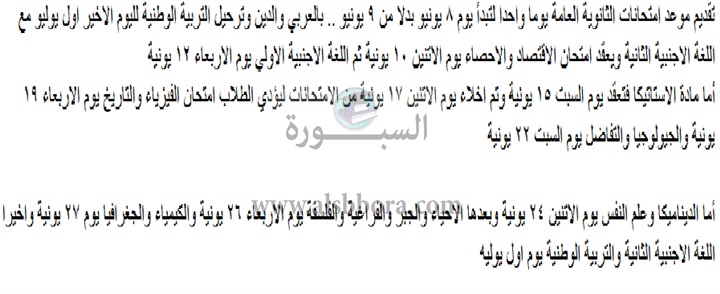 نشرت "السبورة" التعديلات الجديدة بجدول الثانوية العام أخر وضع وذلك بعد الأنتهاء من استطلاع الرأي والتعديلات الأخيرة التي استقبلتها وزارة التربية والتعليم والتي جاءت كالتالي: