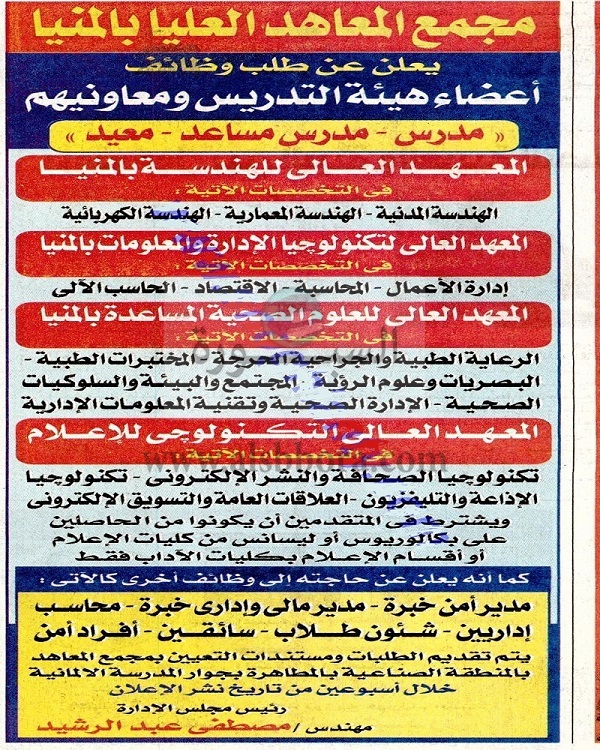 مجمع المعاهد العليا بالمنيا تعلن عن حاجتها الى اعضاء هيئة التدريس من المعيد الى الاستاذ فى 15 تخصصا بـ 4 معاهد