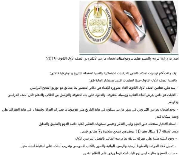 - يوجد امتحان تجريبي الكترونى فى شهر مارس سيكون فى مادة التاريخ على موضوعات حضارات العراق وفينقيا ، فى مادة الجغرافيا على وحدة السكان كله .