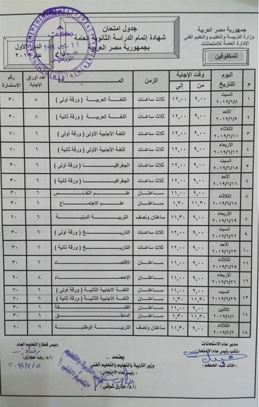 كما اعتمد جدول إمتحان شهادة إتمام الدراسة الثانوية العامة بجمهورية مصر العربية للمكفوفين (الدور الأول) للعام الدراسي الحالي 2018/2019، وقد تقرر أن تبدأ الامتحانات إعتبارا من يوم السبت الموافق 8/6/2019 لتستمر حتى يوم الثلاثاء الموافق 2/7/2019.