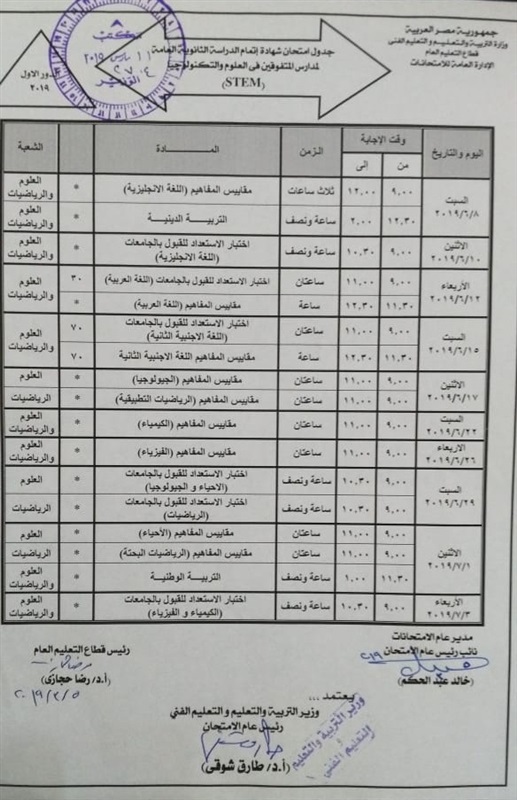 ومن المقرر أن تبدأ امتحانات الثانوية العامة لمدارس المتفوقين في العلوم والتكنولوجيا (ٍSTEM) للدور الأول للعام الدراسي الحالي 2018/2019 اعتباراً من يوم السبت الموافق 8/6/2019 لتستمر حتى يوم الاربعاء الموافق 3/7/2019.