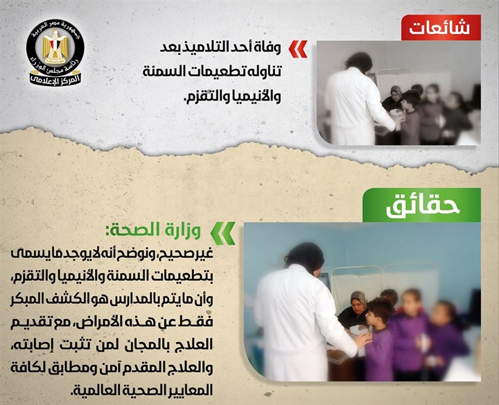 كشف مركز المعلومات بمجلس الوزراء حقيقة ما تم تداوله من وفاة احد التلاميذ بعد تناوله تطعيمات التى يتناولها التلاميذ فى المدارس ضد السمة والانيميا والتقزم.