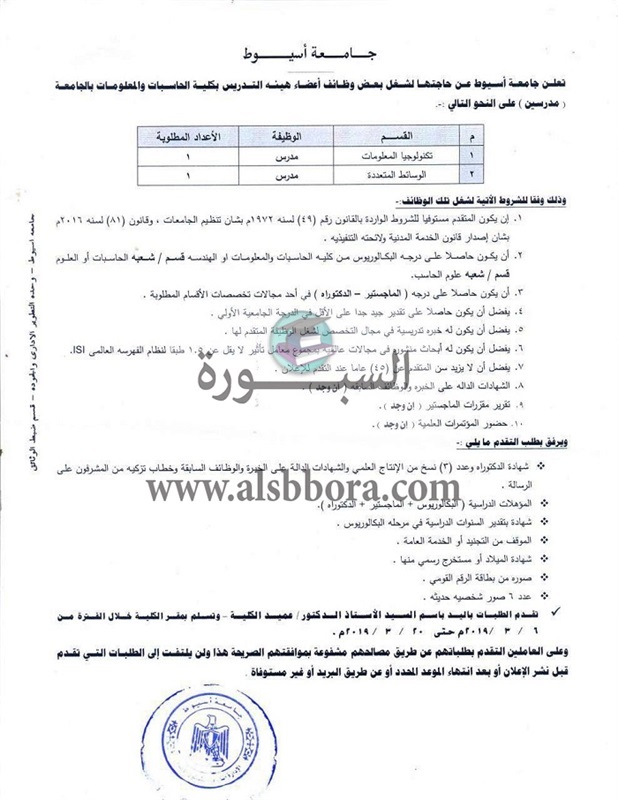 تعلن جامعة أسيوط عن وظائف جديدة لأعضاء هيئة التدريس "من معيد إلي أستاذ" وذلك وفقا لنص الإعلان التالي:-