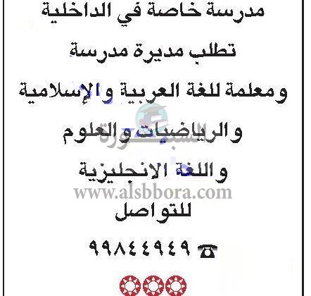 أعلنت مدرسة خاصة في سلطنة عمان عن وظائف جديدة للمعلمين والمعلمات وذلك وفقا لنص الإعلان التالي: