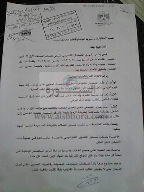 ارسلت وزارة التربية والتعليم والتعليم الفنى، خطابا الى جميع المديريات التعليمية والادارات والمدارس على ان يتم تطبيقها خلال عقد الامتحانات الالكترونية للصف الأول الثانوى بداية من يوم 24 مارس الجارى الى 4 ابريل المقبل.