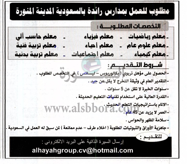 تعلن مدارس المدينة المنورة بالسعودية عن وظائف جديدة للمعلمين والمعلمات المصريين في 9 مواد وذلك وفقا لنص الإعلان التالي:-